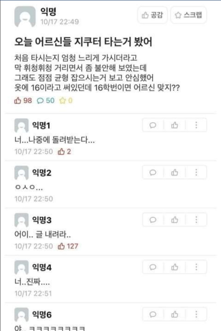 ??? : 솔직히 어르신들 전동 킥보드 못타게 해야하는거 아님? 본문